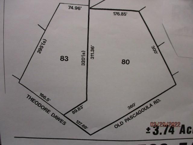 3.74+/- commercial acres on 2 parcels, including corner lot at busy intersection of Theodore Dawes Road and Old Pascagoula Roads, across from the neighborhood Wal-Mart. One intersection north of I-10 at exit 13, on new 5 lane road. Perfect for strip shopping cente, free standing building, bank, fast food or convenience store. Great location, visibility and ACCESSIBILITY. To be sold with Parcel R02-33-09-31-4-000-080 (Key # 01163449). Both for a total of $2,000,000.00